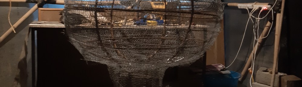 Then D10 horizontal ribs, circles (bent around a barrel and a concrete cone cast from a road cone) were tied to the vertical ribs on the inside. Then I wound fencing wire (medium tensile, heavier gauge ‘no.8’ wire) around the outside of the ribs. The ribs of the big gourd were supported by a drum shape bent from 150mm square mesh.